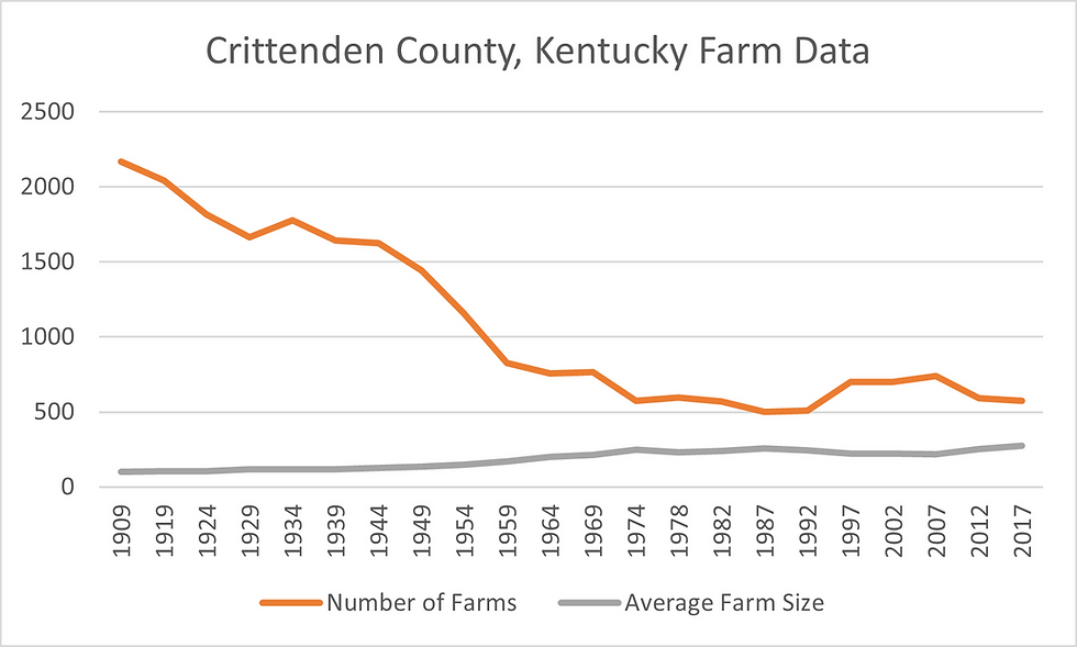 After 1900, the number of farms began to sharply decrease in Crittenden County due to a growing number of spar mining operations that sprang up across the county. Moreover, those who were not engaged in spar mining often traveled to adjacent counties to work in the coal mines. This rapid change in employment is visible in the chart above, which shows a sharp decrease in the number of farms and an increase in the average farm size in Crittenden County from 1909 through 2017.[10] Even though the number of farms has decreased since the turn of the century, its early role set both Crittenden County and Western Kentucky on a path toward economic growth. Sadly, as generations pass, the part that farming played in the local community and the oral history of farming practices steadily becomes lost to the ages.
